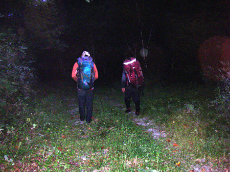 テントを撤収して暗くなると同時に林道着。