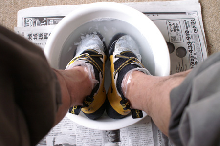 そこでさらなる快適さを求めて渡辺数馬さんのブログで紹介されていた、リンスを入れたお湯に靴を履いたまま20〜30分漬けるを実行しました。