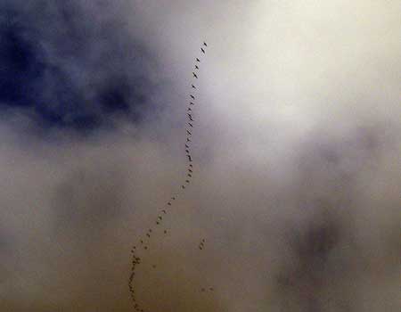 白鳥なのかな?渡り鳥の集団が賑やかに飛んでいる。