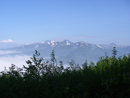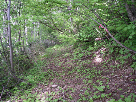 林道交点からこの区間は積雪期には個人的には一二を争う暑寒別山群の展望台だと思っているが、無積雪期には群別岳が木々の間からかろうじて見える。