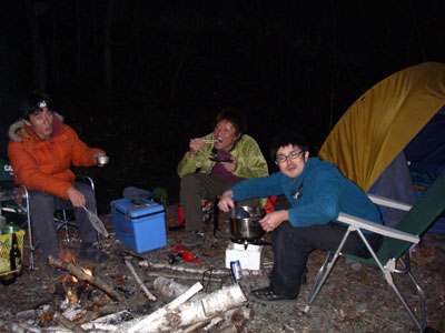 夜は鹿ハウス横の空き地でたき火とインテリおでんとヨットスクール大演奏会